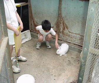 アニマルパラダイス いきものだいすき1ねんせい! 「うさぎはふわふわできもちがいいなぁ。」 うさぎやチャボなどのいきものとふれあいながら、まいしゅう、とうばんのひにしいくごやのそうじやえさやりなどをのせわも、しっかりがんばっています。 |