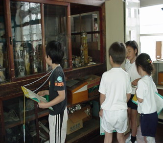 りかしつ りかしつのとだなには、1ねんせいがきょうみしんしんのものがたくさんあります。みたいけれど、こわい。こわいけれど、みたい。それは、ひょうほんです!さる、へび、かえる、・・・。またまた、じんたいもけい。がっこうにはこんなへやがあったんだね。 |