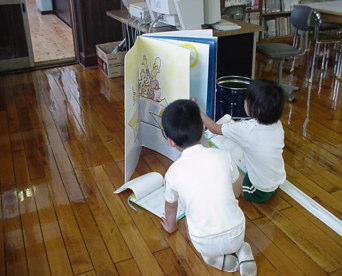 としょしつ ずらりとならぶ ほん・ほん・ほん!なんと3000さついじょうのほんがあります。えほんがだいすきなこどもたち!にんきのほんは、しかけのあるえほんやこわいおはなしです。おおきなえほんにびっくりしながらたのしくよんでいました。 |