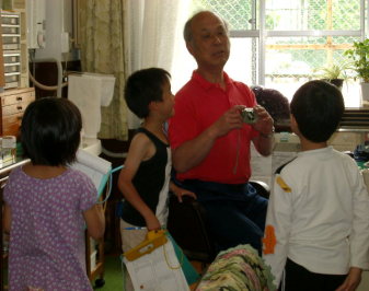 こうちょうしつ いつもにこにこがおの、こうちょうせんせい。まいあさ、こうもんでおおきなこえのあいさつでむかえてくれます。こどもたちもまけずにあいさつ 「おはようございます!」 |