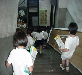 ちかしつ まるでひみつのとびらのように、いつもかぎのかかっているおおきなとびら・・・。そこをあけると、ちかにつづくかいだんがありました。こどもたちはおそるおそるかいだんをおりていきました。するとそこには・・・!おおきなライトやダンボールでできたかたなやいえ、たくさんのつくえ・・・。がくげいかいやうんどうかいでつかうおおどうぐなど、いろいろなどうぐがおいてありました。 |