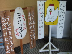 ![]() 子どもたちが充実した活気あふれた一日を過ごすためには,朝から目も頭も覚ますことから,始めなければならないことを自覚させるために取り組んでいます。「早く起きるためには早くねること」「早くねるにはしっかり汗をかくこと」という基本的な生活習慣の大切さを子どもたちは体験を通して感じています。 コケコッコー運動の内容 ・よく遊びます 始業前、中間休み、昼休み、放課後に教職員と共にたくさん遊びます。 ・テレビは見ません テレビ視聴を考える。(見方・番組の選択・テレビゲームなど) ・おやつはたべません 夜おそくになっても満腹感があると、快い目覚めをさまたげます。 空腹感が快い目覚めにつながり、またおいしい朝食にもつながります。 あすははやくおきます 0と5のつく日はコケコッコーデーとし、とくに強調してがんばる日としています。 |