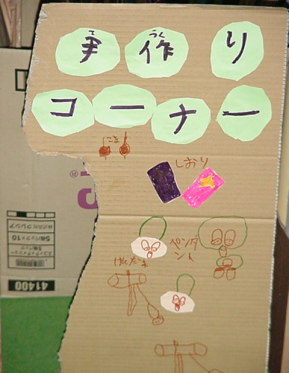 てづくりコーナーでは、木のみや木のはをつかっていろいろなものがつくれます。ペンダント・しおり・けん玉・こまなどができます。 |