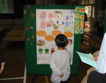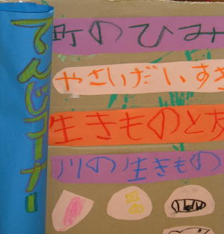 | てんじコーナーです。 町のひみつ・やさいだいすき・生きものとともだちなど、まとめたものをてんじしています。 |