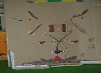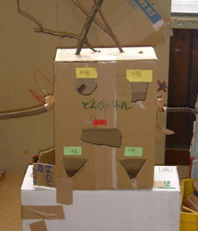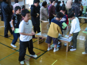 | このゲームは「どんぐりバトルゲーム」といいます。 木のみをなげて、あなのあいたところに入れます。 100点・50点・10点・1点があって、一人6回なげることができます。300点いじょうとるとおみやげがもらえます。 ちょっとむずかしいです。 |
