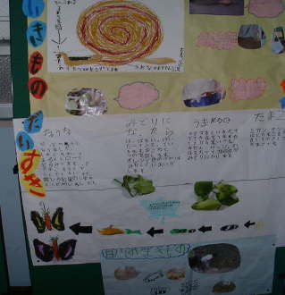 | カタツムリ・アゲハチョウ・白川にいるいきものについてしらべました。 | やさいしんぶんです。みんなでせわをしてそだてたやさいのことをしんぶんにまとめました。 |