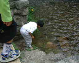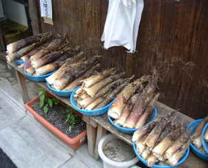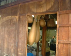 | 白川にかかっているはしのそばにあるお店で,こんなものを見つけました。たくさんのたけのこと,ものすごく大きなひょうたんです。 | |