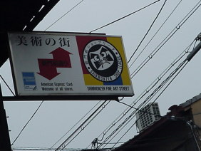 | だるまのマークを見つけました。このかんばんは,古いものをうっている店がならんでいる通りにあります。店には,きもの・つぼ・さら・絵など古いものがかざってあります。 |