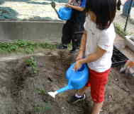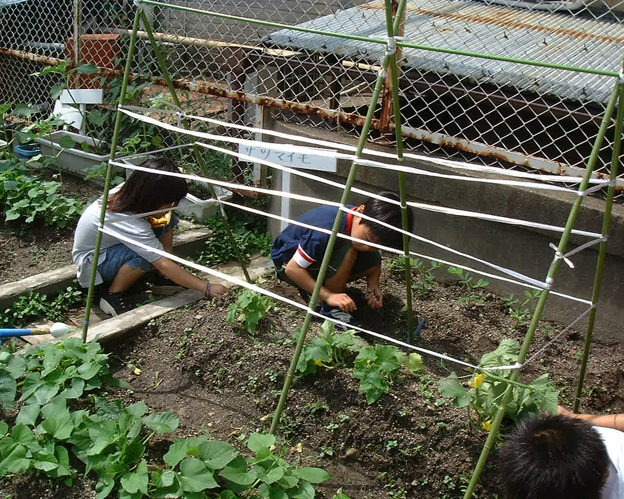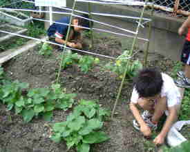 春にエダマメ・ラッカセイの種まきと,ミニトマト・キュウリ・サツマイモ・シシトウのなえうえをしました。