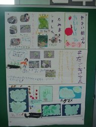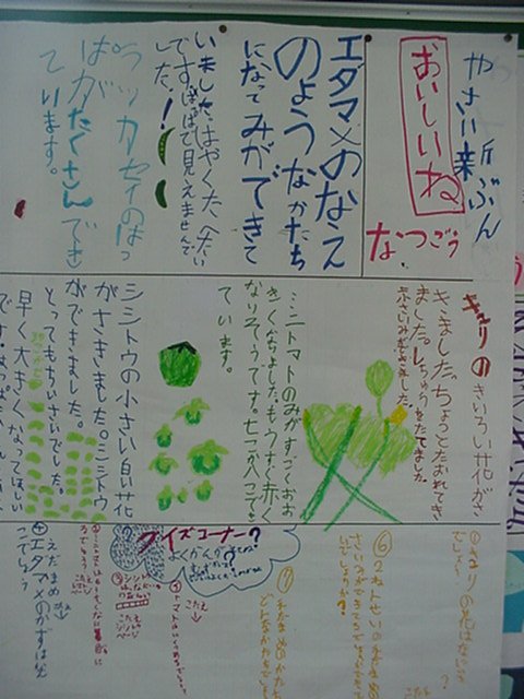 やさいしんぶんをつくりました。名前は「おいしいね」です。春号と夏号です。クイズがのせてあります。全校のみんなにしょうかいしました。