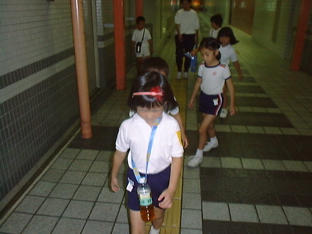 2回目の校区探検に出かけました。今度は駅や公園に行ってみました。公園ではおにごっこをしたり,カードとりをしたりして遊びました。 三条京阪駅の構内を歩きました。これは,点字ブロックの上を歩いているところです。