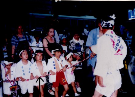 神輿の日には、女の子は神輿をかつげないのでいっしょについていきます。 家の人は、さば寿司とかごちそうを作ります。小さい幼稚園ぐらいの女の子やまだ神輿をかつげない男の子は、つなをもってみんなが神輿をかついでいる前を歩きます。神輿の一番前を堂々として歩きます。 その時「ヨイヤッサージャー」といって 歩きます。やじるしがさしているのは、 つなです。つなは、前を歩くときに持ちます。 このおじさんは、息切れするぐらい「ヨイヤッサージャー」 と言いはります。初めて、ハッピを着る子は 大なすずを体にかけます。 |