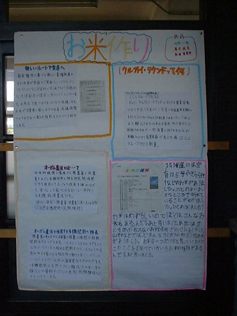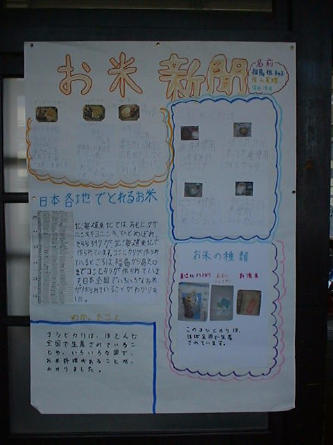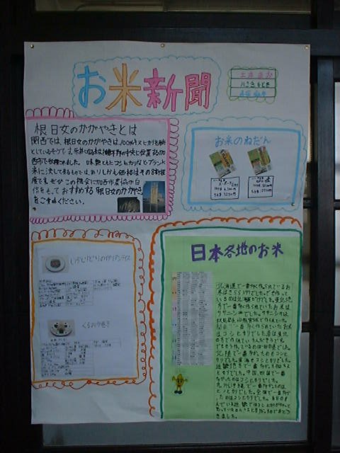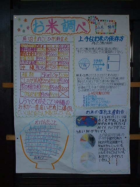 | 私は、お米新聞を作って新聞を、作るまでに、 いろんなことをしました。ホームページを使っ て、お米について調べたりもしました。私は、 魚沼北のこしひかりの料金に、ついて調べまし た。調べてわかったことは、沖縄のお米が一番 高かったことが、わかりました。 |