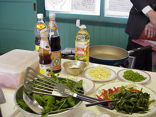 私たちのグループは、バジル丼を、つくりました。 材料は、赤ピーマン、青ピーマン、バジル、たまご、とうがらし、にんにく、鶏肉です。 調味料は、油、ナンプラー、ソース、オイスターソース、を用意します。 |