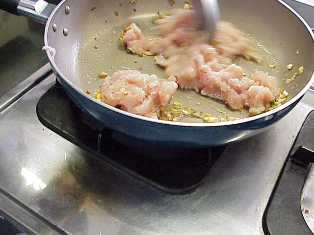 次に、にんにく、とうがらし、を油で先にいためます。 そして鶏肉を入れまた炒めます。 炒めた鶏肉に、ナンプラー、ソース、オイスターソースを入れます。 そこにバジルを入れて、すこし水を入れます。 |