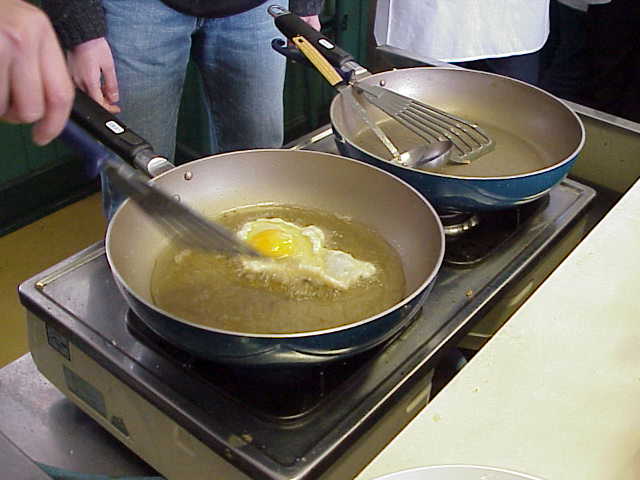 次に油たくさんいれて、目玉焼きを焼きます。 タイでは、目玉焼きは揚げるように焼きます。 油を卵の上にかけていきます。 けど油が、いっぱいとんでこわかったです。 |