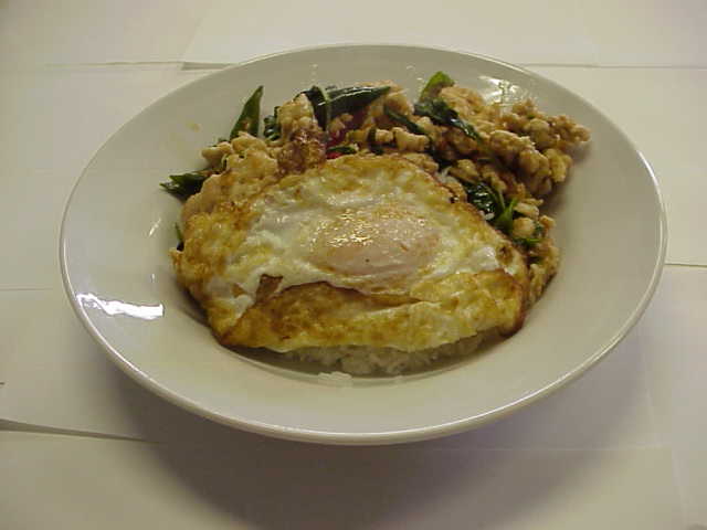 タイ米に、できた料理をかけて、その上に焼いた目玉焼きをのせます。 それで、できあがりです。 これができあがりです。 味の方は、少しからかったですが、おいしかったです。 目玉焼きをのせるのがむずかしかったです。目玉焼きをのせるときにつぶれたりもしました。 でもとてもおいしかったです。 |